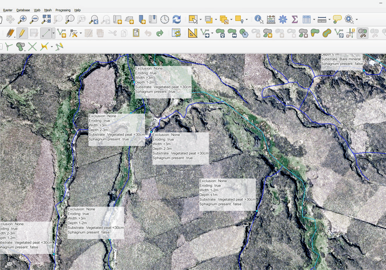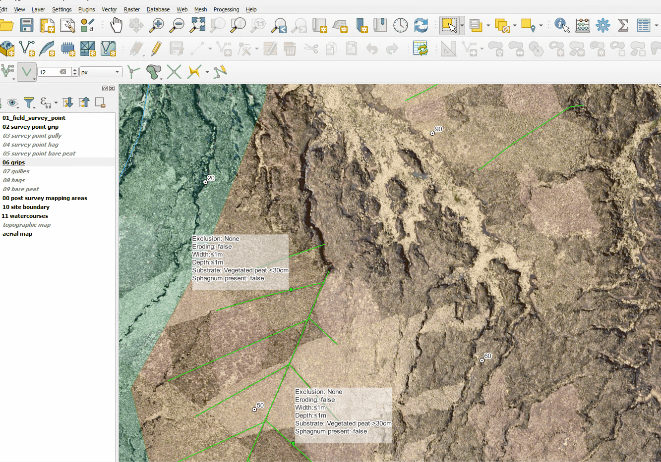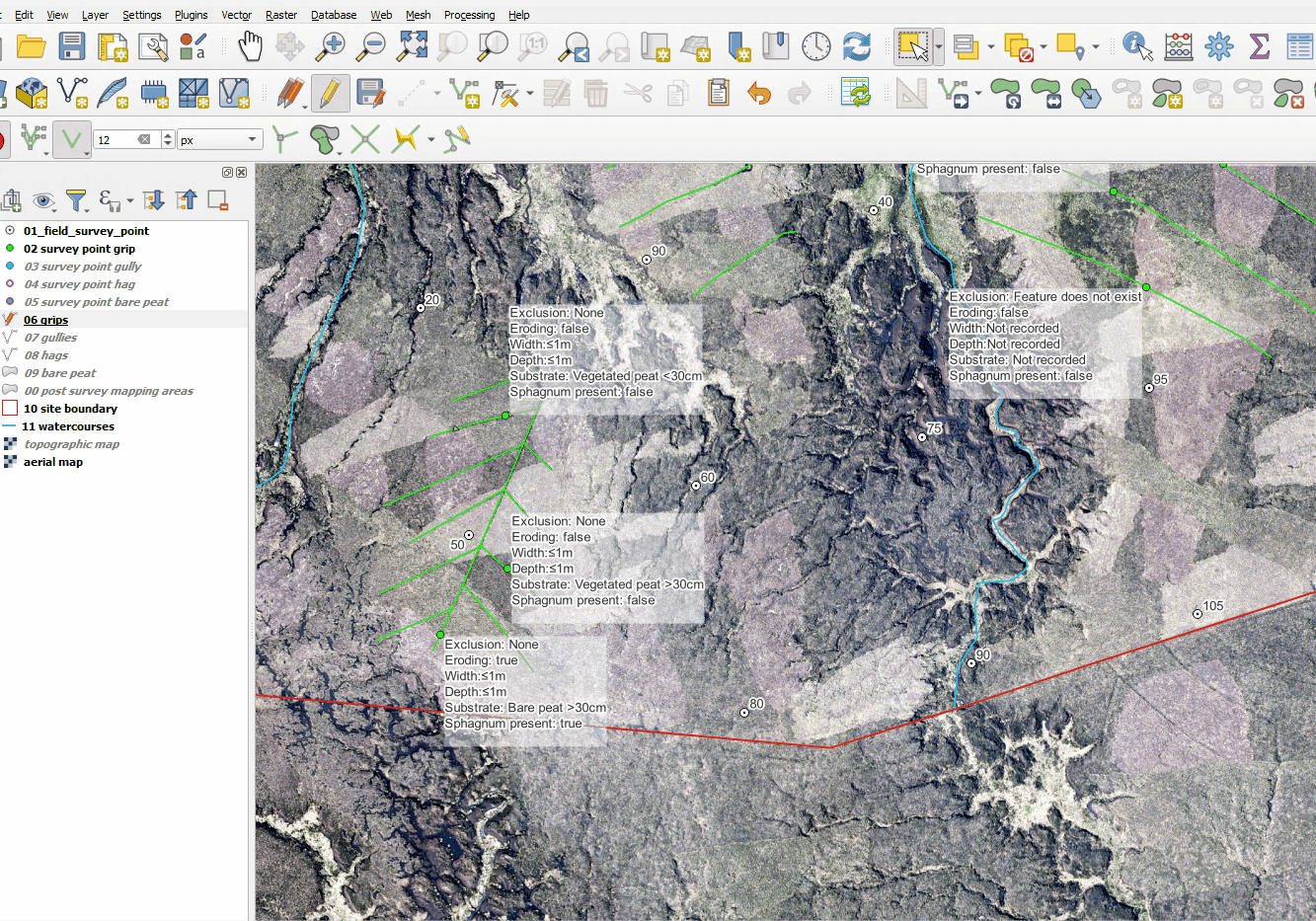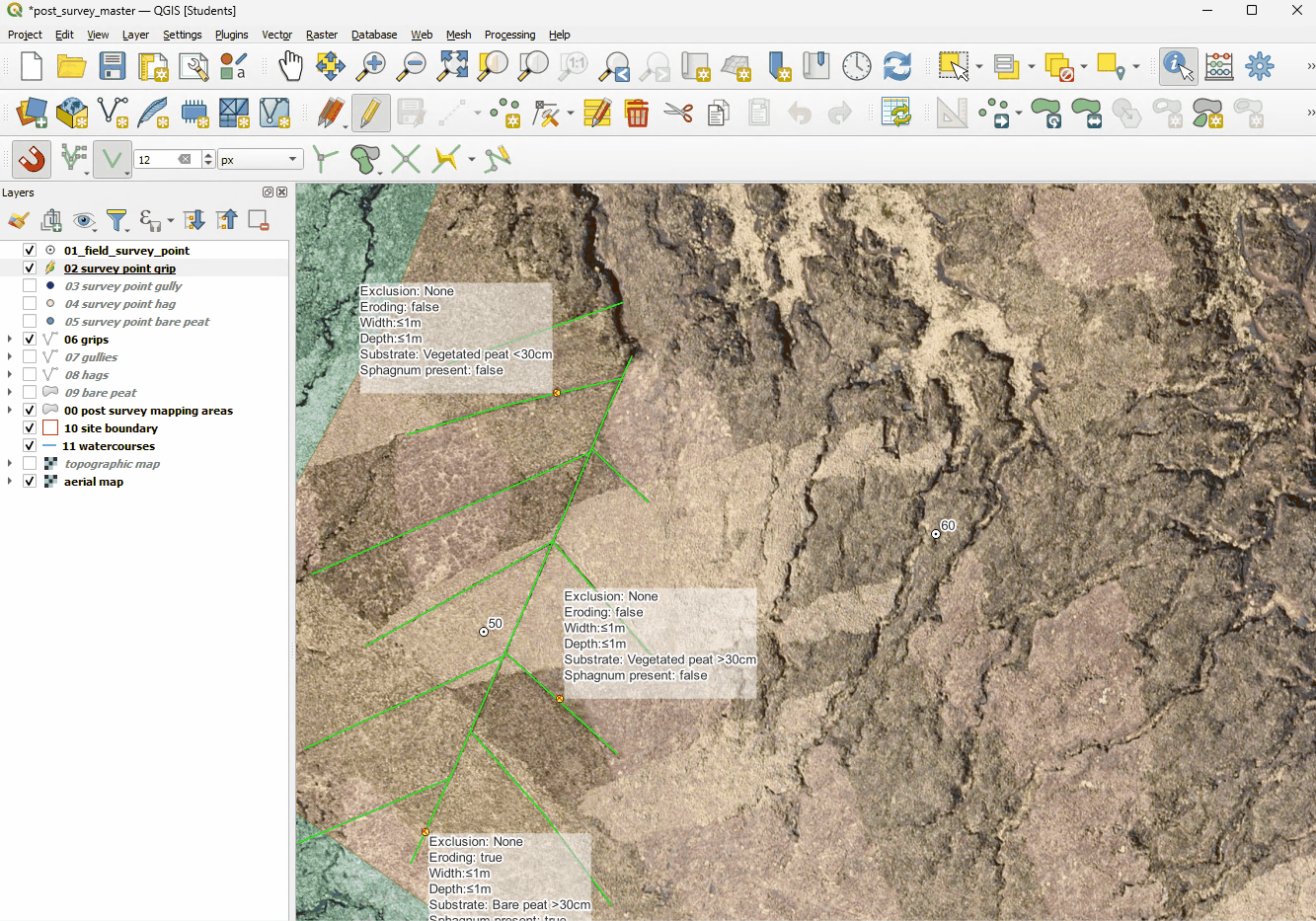 In this section of the course you will be checking a number of features mapped in the Pre-mapping (3.2) phase and comparing them to the information recorded during a subsequent field survey. The field survey results are recorded as points. For clarity we have set their data to be displayed in Labels.